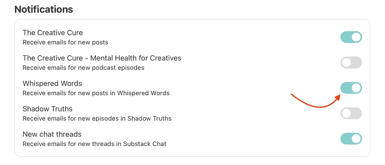 Quick announcement: I think I’ve finally found a structure for The Creative Cure that feels in alignment (for now 🤣): A weekly mix of personal experiences that people (hopefully) find relatable, insight into my work as a psychotherapist for creatives that people will (hopefully) find helpful, and poems/short stories people will (hopefully) enjoy because they are inspired by the former two. If you’d rather not get the fictional works, you can toggle them off via your settings: